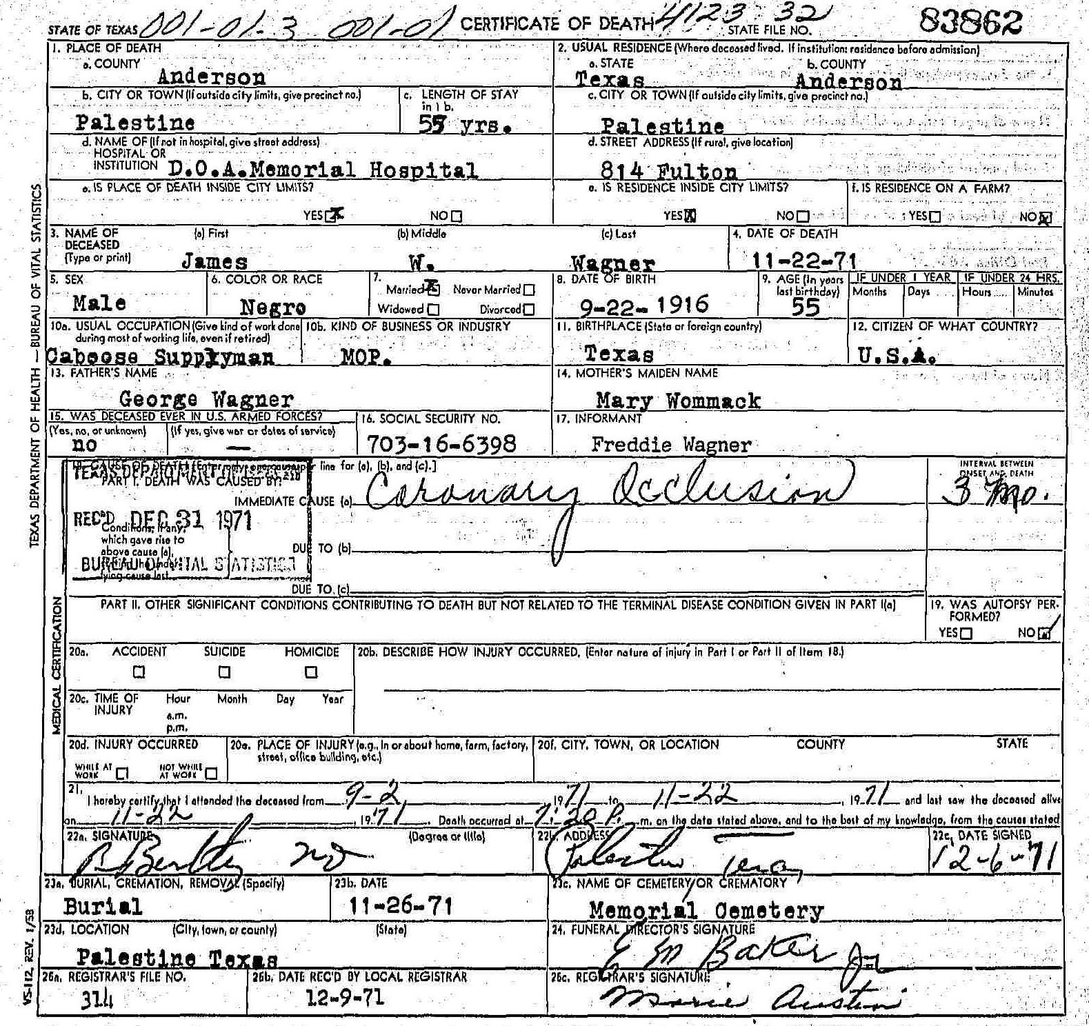 death. He departed this life November 22, 1971 at 7:05 p.m. at