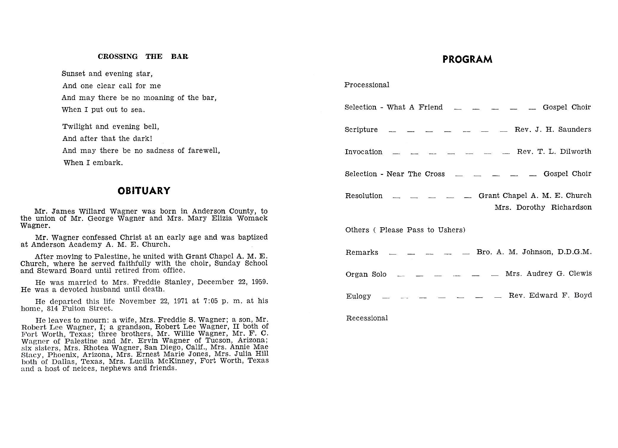 Robert Lee Wagner, II both of Fort Worth, Texas; three brothers, Mr.