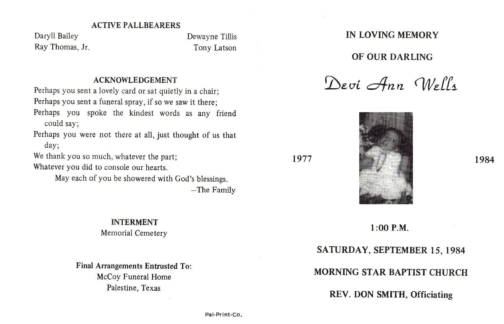 Little Devi Ann Wells was born August 30, 1977, to Mr. and Mrs. T.R. Wells in Palestine, Texas.