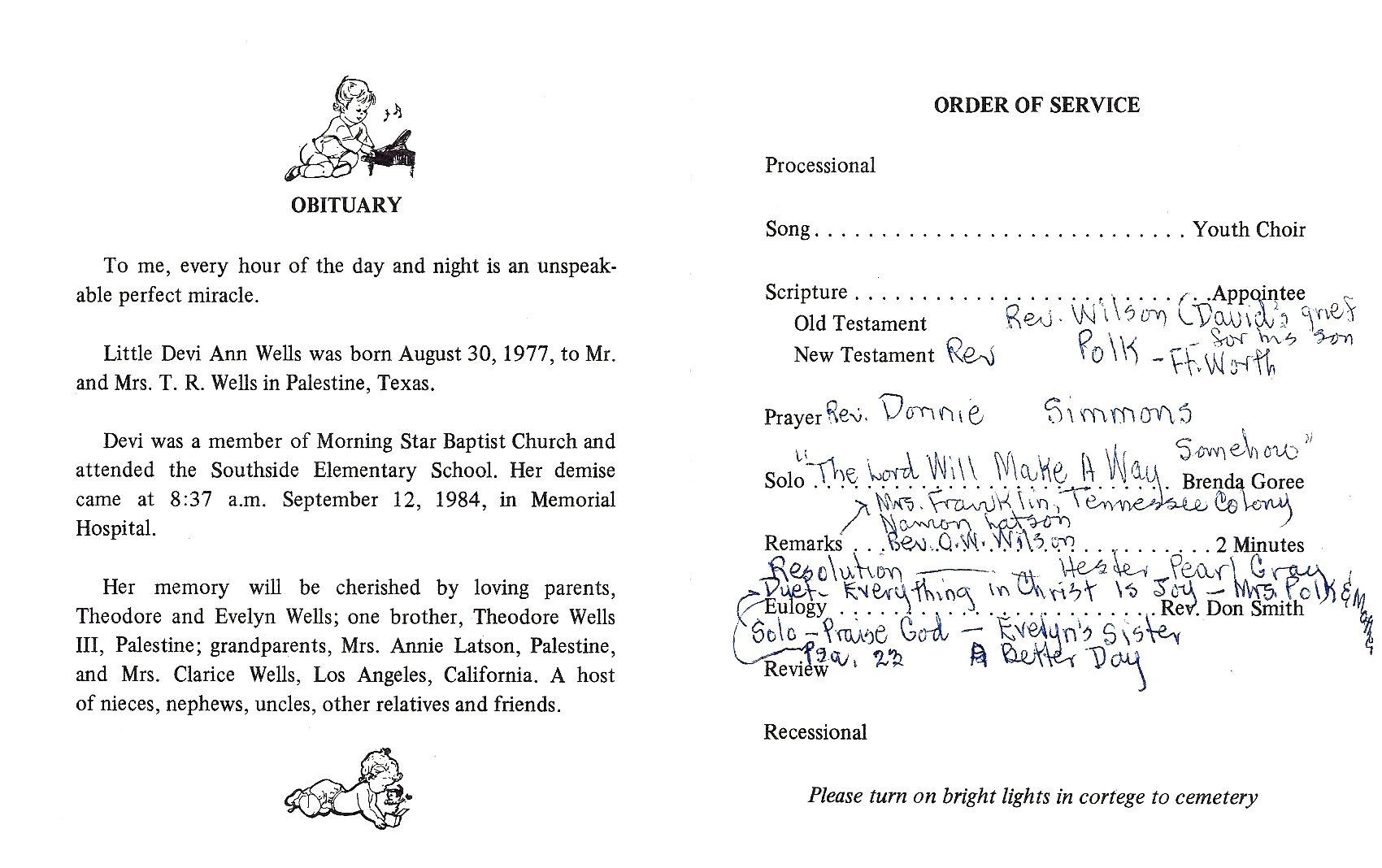 Devi was a member of Morning Star Baptist Church and attended the Southside Elementary School.  Her demise came at 8:37 a.m. September 12, 1984, in Memorial Hospital.