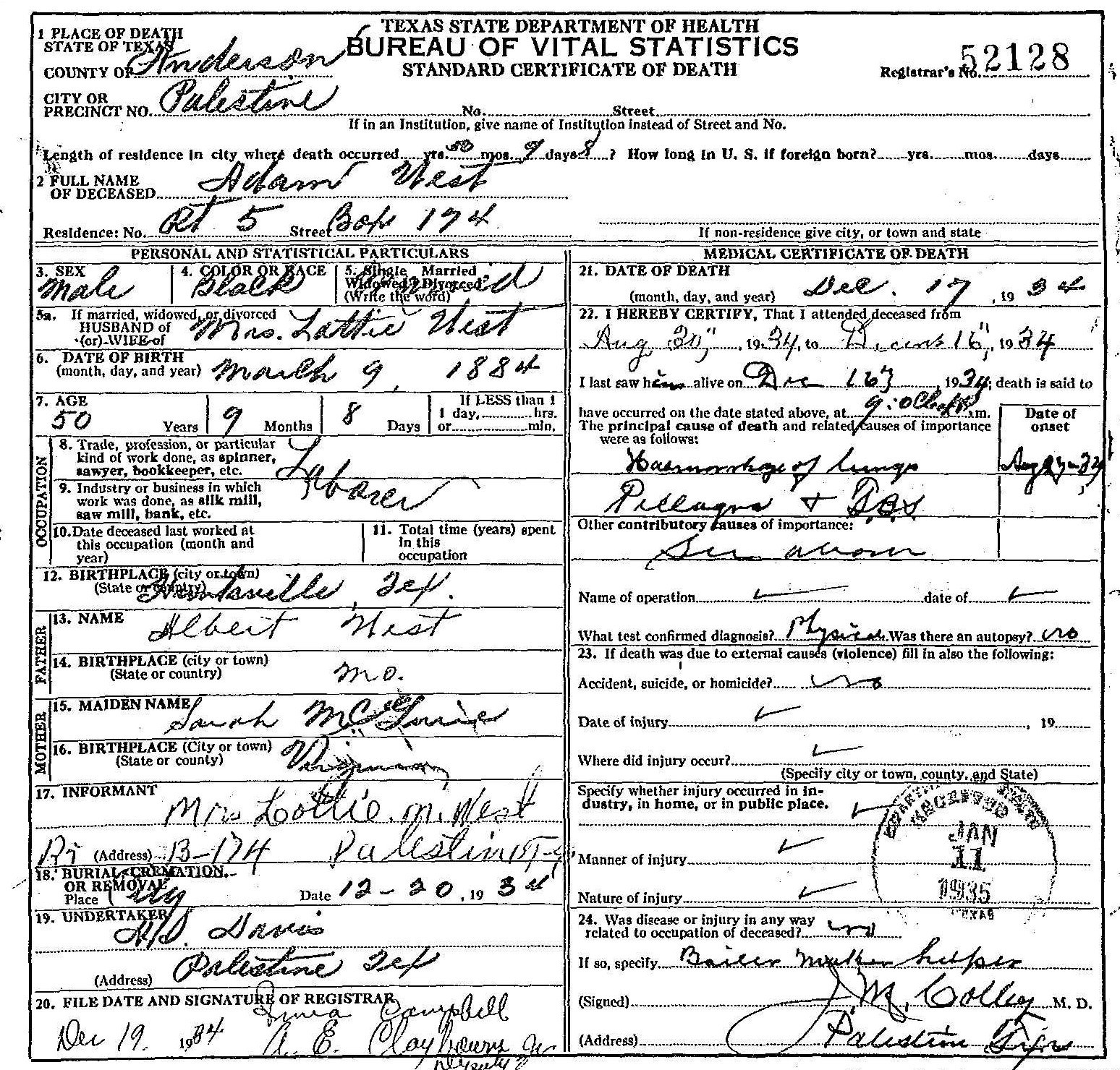 Died:  17 December 1934 - Palestine, Anderson, Texas