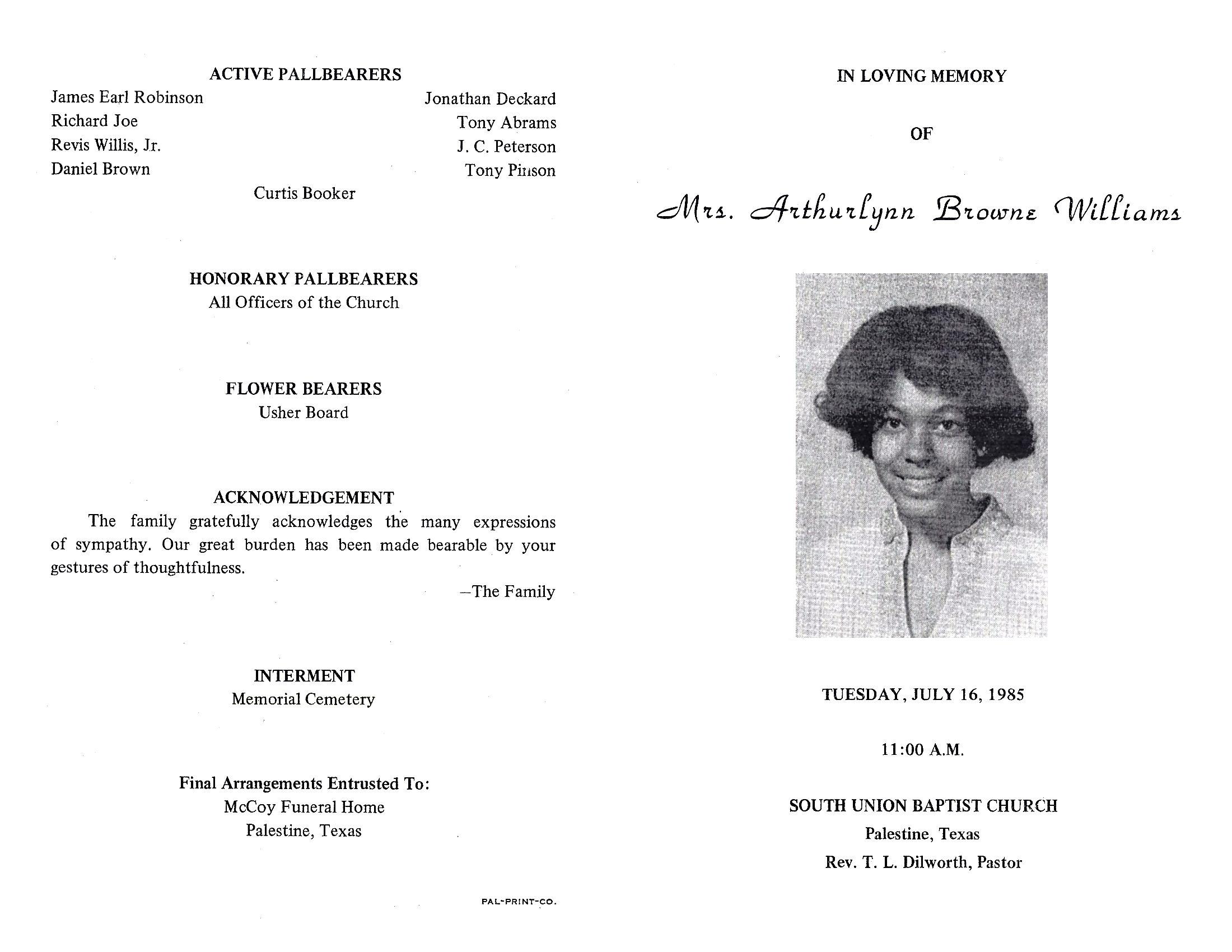 Sister Arthurlynn Williams, the daughter of Mr. and Mrs. Reginald O. Browne, Sr., was born March 29, 1956.