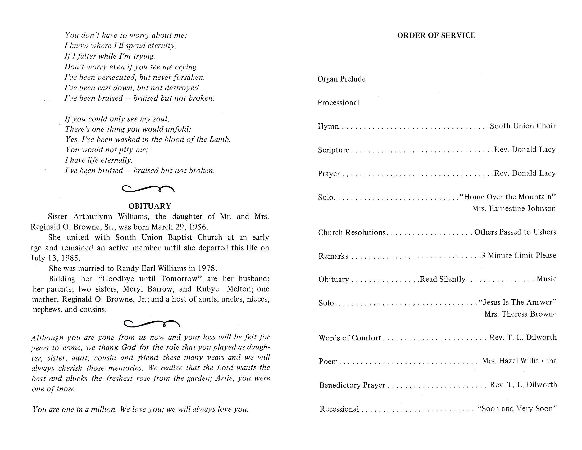 Bidding her "Goodbye until Tomorrow" are her husband; her parents; two sisters, Meryl Barrow, and Rubye Melton; one mother< Reginald O. Browne, Jr.; and a host of aunts, uncles, nieces, nephews, and cousins.