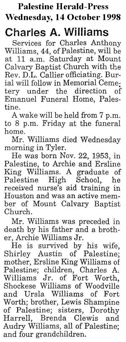 under the direction of Emanuel Funeral Home, Palestine. A wake will be held from 7 p.m. to 8 p.m. Friday at the funeral home. Mr. Williams died Wednesday morning in Tyler. He was born Nov. 22, 1953, in Palestine to Archie and Ersline King Williams. A graduate of Palestine High School, he received nurse's aid training in Houston and was an active member of Mount Calvary Baptist Church. Mr. Williams was preceded in death by his father and a brother, Archie Williams, Jr. He is survived by his wife, Shirley Austin of Palestine; mother, Ersline King Williams of Palestine; children, Charles A. Williams Jr. of Fort Worth, Shockese Williams of Woodville and Ursla Williams of Fort Worth; brother, Lewis Shampine of Palestine; sisters, Dorothy Harrell, Brenda Clewis and Audry Williams, all of Palestine; and four grandchildren. |