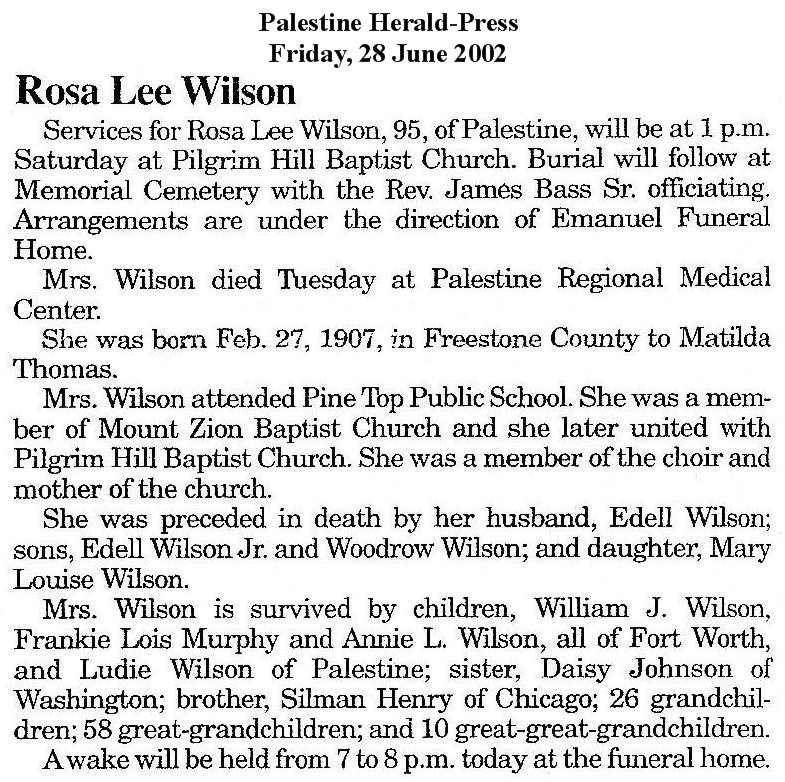 Services for Rosa Lee Wilson, 95, of Palestine, will be at 1 p.m.