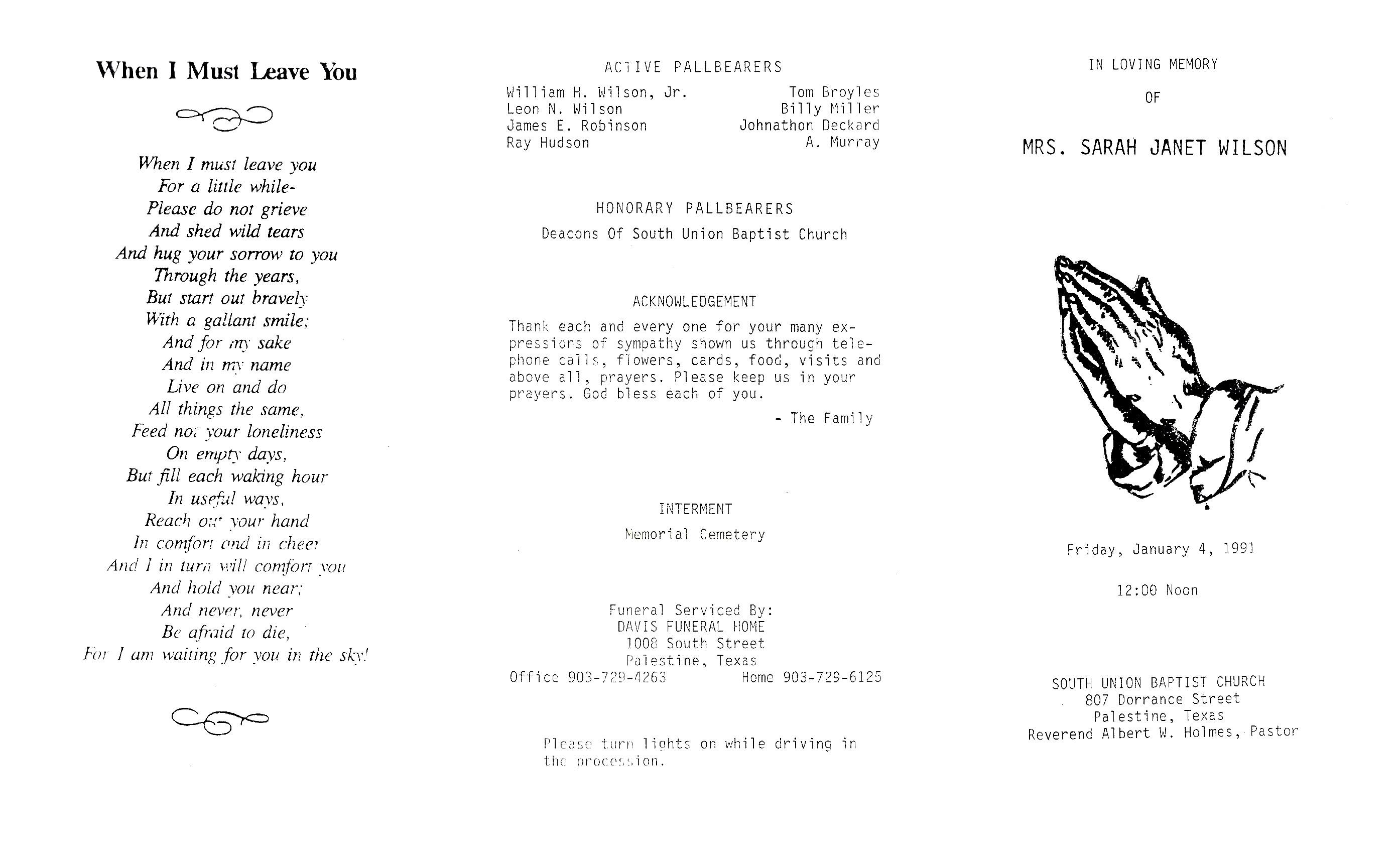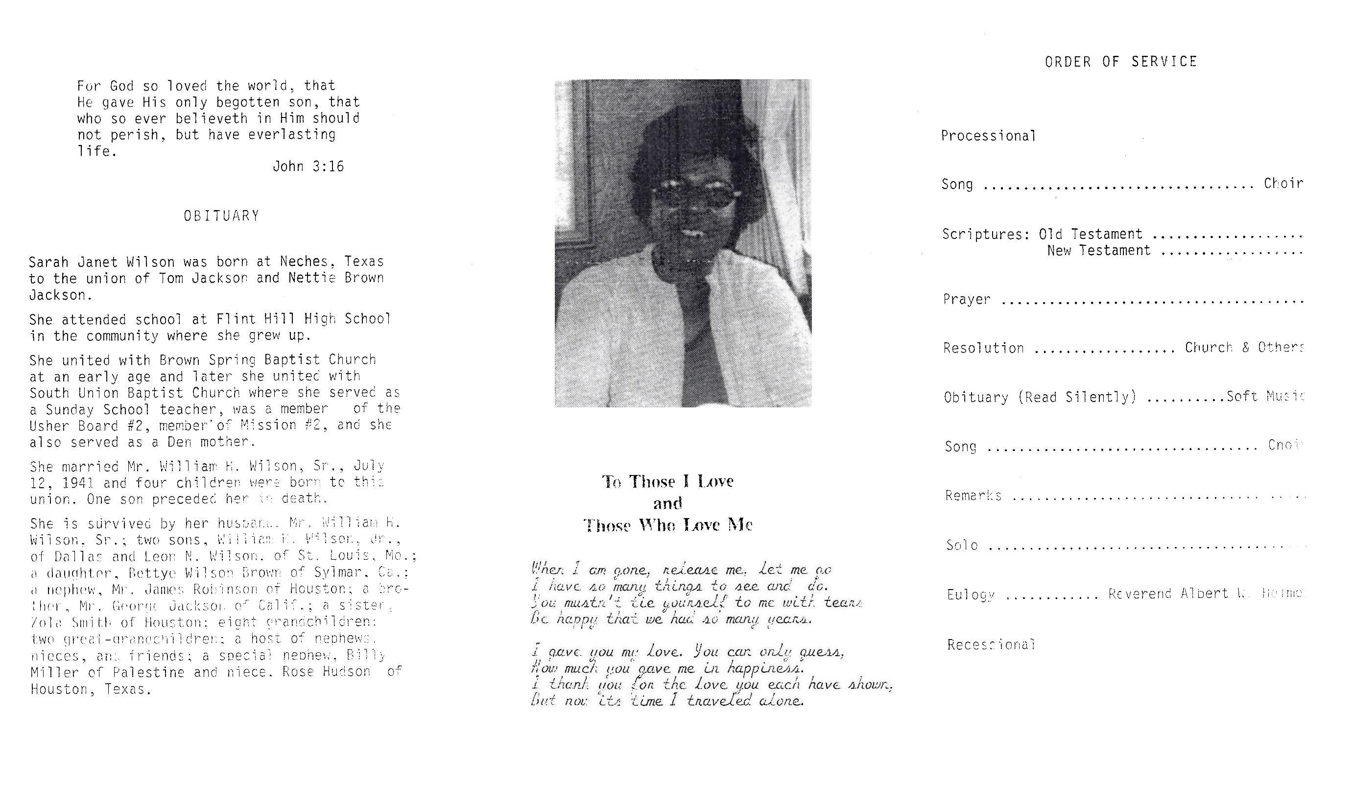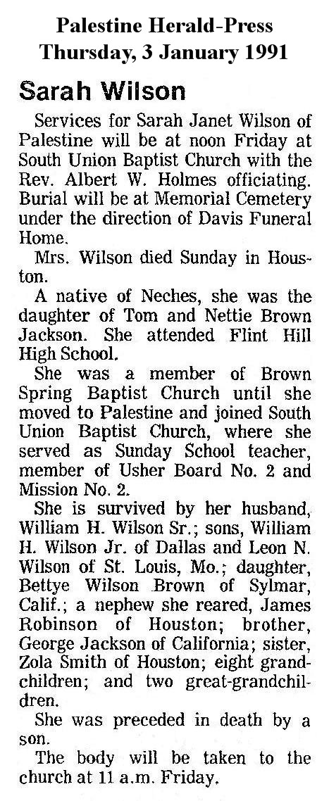 Jackson and Nettie Brown Jackson. She attended school at Flint Hill High School in the community where she grew up. She united with Brown Spring Baptist Church at an early age and later she united with South Union Baptist Church where she served as a Sunday School teacher, was a member of the Usher Board #2, member of Mission #2, and she also served as a Den mother. She married Mr. William H. Wilson, Sr., July 12, 1941 and four children were born to this union. One son preceded her in death. She is survived by her husband, Mr. William H. Wilson, sr.; two sons, William F. Wilson, Jr., of Dallas and Leon N. Wilson of St. Louis, Mo.; a daughter, Bettye Wilson Brown of Sylmar, CA.; a nephew, Mr. James Robinson of Houston; a brother, Mr. George Jackson of Calif.; a sister, Zola Smith of Houston; eight grandchildren: two great-grandchildren: a host of nephews, nieces, and friends; a special nephew, Billy Miller of Palestine and niece. Rose Hudson of Houston, Texas |