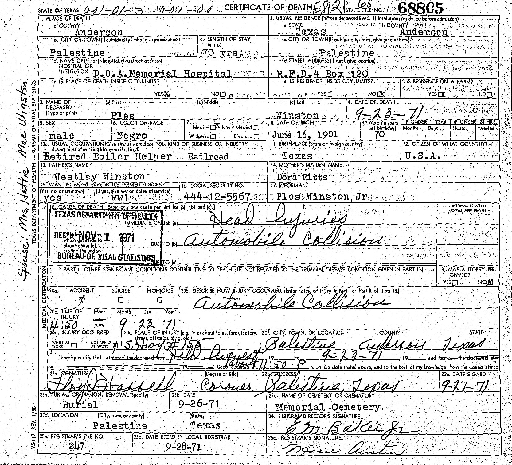 Spouse:  Hattie Mae Hunter - 17 October 1970 - Anderson County, Texas
