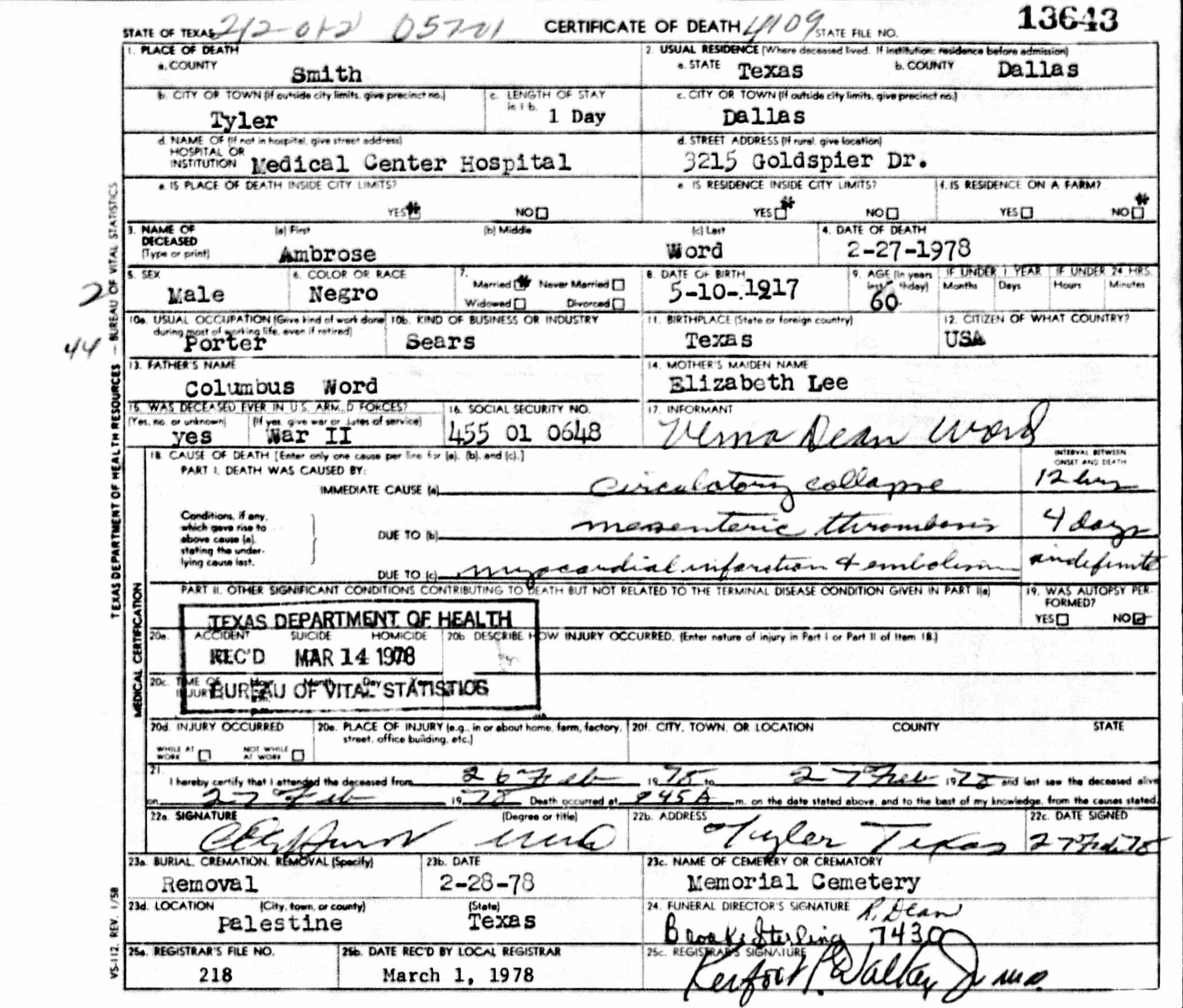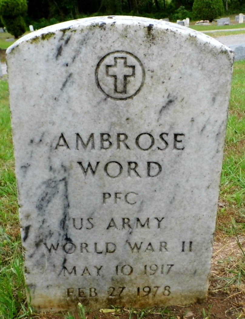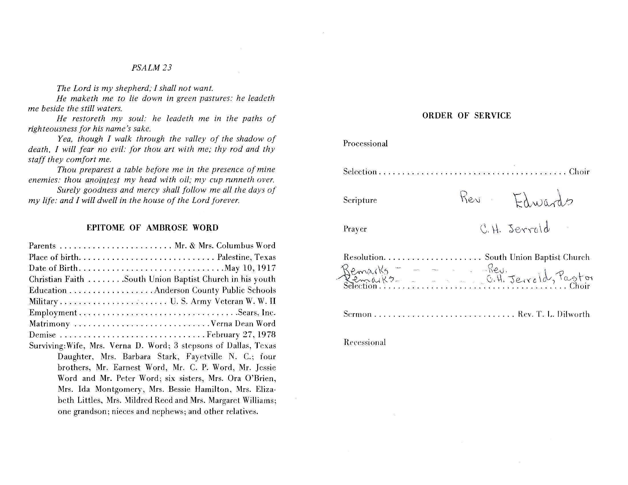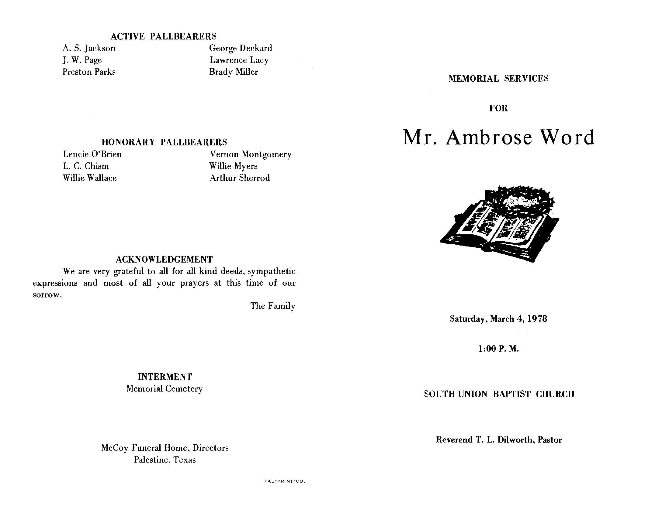 EPITOME OF AMBROSE WORD Parents - Mr. & Mrs. Columbus Word Place of Birth - Palestine, Texas Date of Birth - May 10, 1917 Christian Faith - South Union Baptist Church in his youth Education - Anderson County Public Schools Military - U.S. Army Veteran W.W. II Employment - Sears, Inc. Matrimony - Verna Dean Word Demise - February 27, 1978 Surviving: Wife - Mrs. Verna D. Word; 3 stepsons of Dallas, Texas Daughter - Mrs. Barbara Stark, Fayetteville, N.C. Brothers - Mr. Earnest Word, Mr. C.P. Word, Mr. Jessie Word and Mr. Peter Word Six Sisters - Mrs. Ora O'Brien, Mrs. Ida Montgomery, Mrs. Bessie Hamilton, Mrs. Elizabeth Littles, Mrs. Mildred Reed and Mrs. Margaret Williams One grandson; Nieces and nephews; and other relatives |