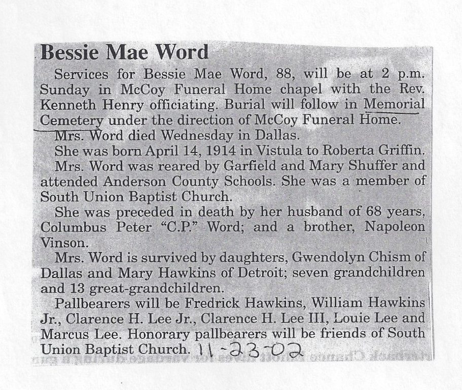 Funeral Home. Mrs. Word died Wednesday in Dallas. She was born April 14, 1914 in Vistula to Roberta Griffin. Mrs. Word was reared by Garfield and Mary Shuffer and attended Anderson County Schools. She was a member of South Union Baptist Church. She was preceded in death by her husband of 68 years, Columbus Peter (C.).) Word; and a brother, Napoleon Vinson. Mrs. Word is survived by daughters, Gwendolyn Chism of Dallas and Mary Hawkins of Detroit; seven grandchildren and 13 great-grandchildren. Pallbearers will be Fredrick Hawkins, William Hawkins Jr., Clarence H. Lee Jr., Clarence H. Lee III, Louie Lee and Marcus Lee. Honorary pallbearers will be friends of South Union Baptist Church. |