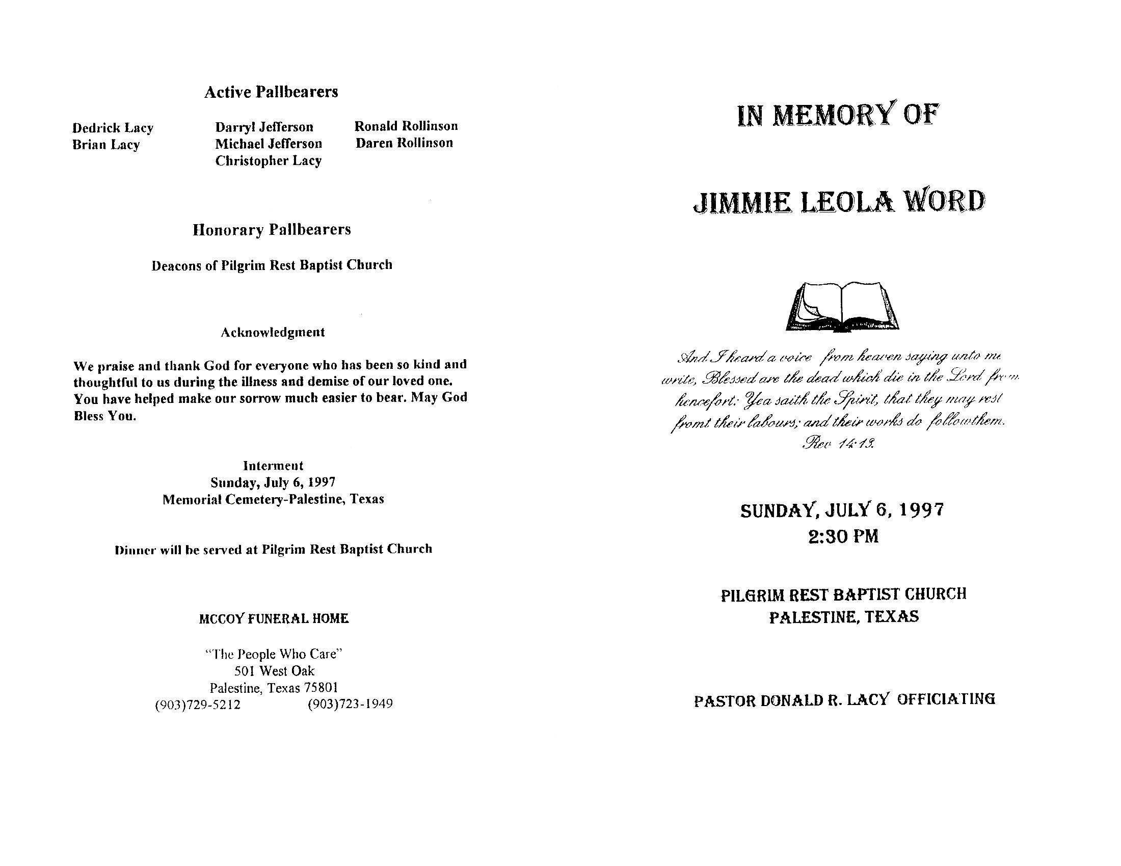 Mrs. Jimmie Leola Word was born in Palestine, Texas to James Abe and