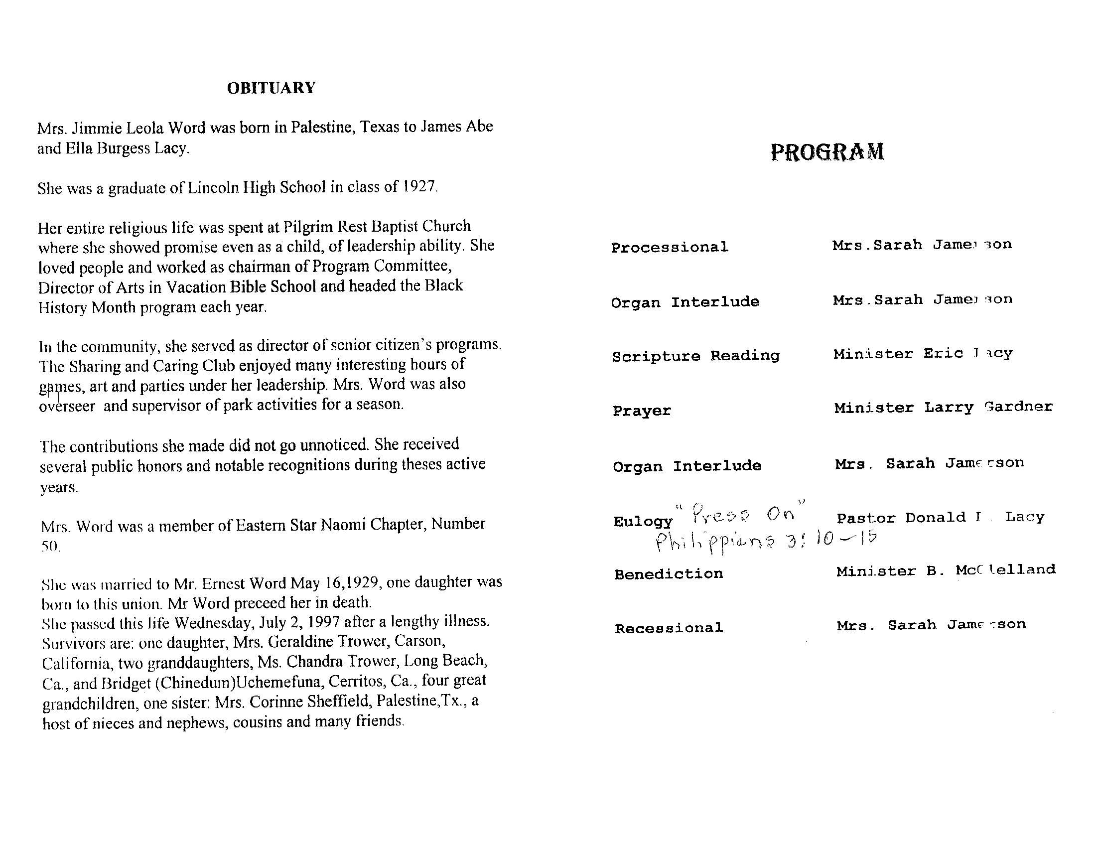 Ella Burgess Lacy. She was a graduate of Lincoln High School in class of 1927. Her entire religious life was spent at Pilgrim Rest Baptist Church where she showed promise even as a child, of leadership ability. She loved people and worked as chairman of Program Committee, Director of Arts in Vacation Bible School and headed the Black History Month program each year. In the community, she served as director of senior citizen's programs. The Sharing and Caring Club enjoyed many interesting hours of games, art and parties under her leadership. Mrs. Word was also overseer and supervisor of park activities for a season. The contributions she made did not go unnoticed. She received several public honors and notable recognitions during these active years. Mrs. Word was a member of Eastern Star Naomi Chapter, Number 50. She was married to Mr. Ernest Word May 16, 1929, one daughter was born to this union. Mr. Word preceded her in death. She passed this life Wednesday, July 2, 1007 after a lengthy illness. Survivors are: one daughter, Mrs. Geraldine Trower, Carson California, two granddaughters, Ms. Chandra Trower, Long Beach, Ca. and Bridget (Chinedum) Uchemefuna, Cerritos, CA., four great grandchildren, one sister; Mrs. Corinne Sheffield, Palestine, TX., a host of nieces and nephews, cousins and many friends. |