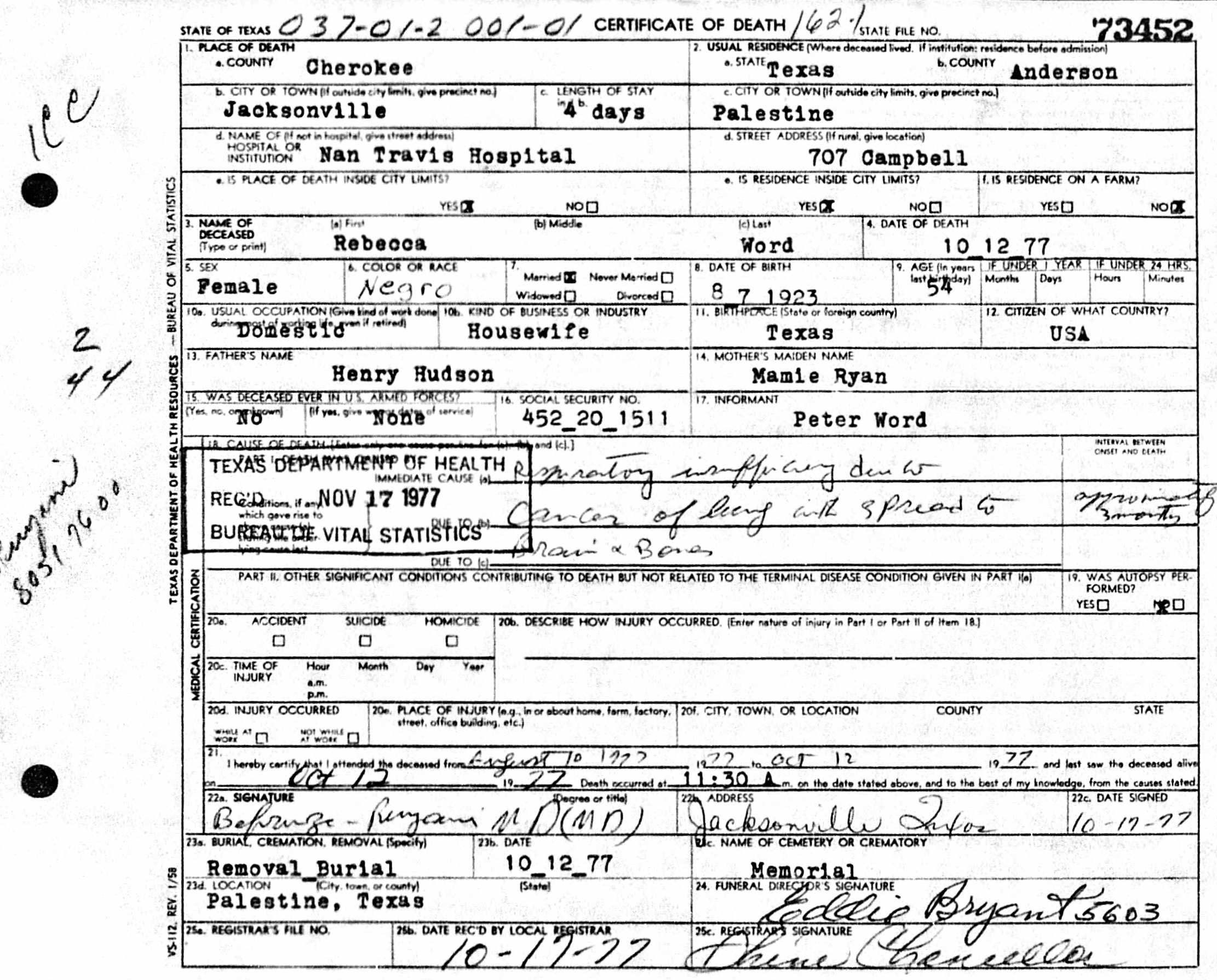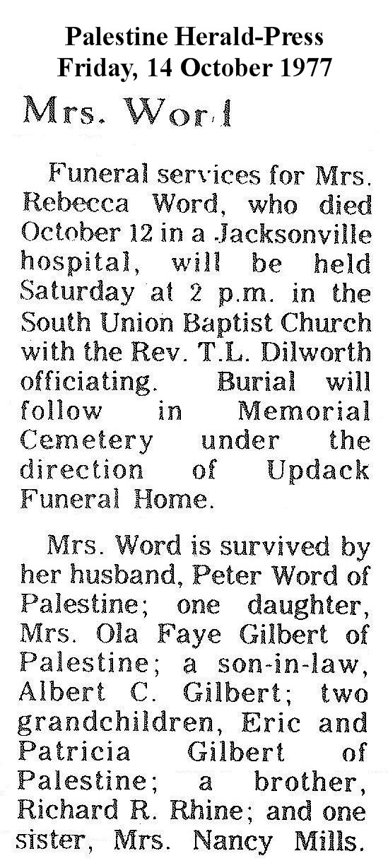 Updack Funeral Home. Mrs. Word is survived by her husband, Peter Word of Palestine; one daughter, Mrs. Ola Faye Gilbert of Palestine; a son-in-law, Albert C. Gilbert; two grandchildren, Eric and Patricia Gilbert of Palestine; a brother, Richard Rine; and one sister, Mrs. Nancy Mills. |
