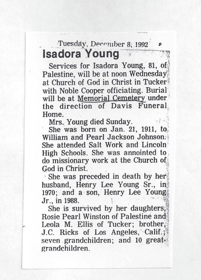 Tuesday December 8 1992 ISADORA YOUNG Services for Isadora Young, 81, of Palestine will be at noon Wednesday at Church of God in Christ in Tucker with Noble Cooper officiating. Burial will be at Memorial Cemetery under the direction of Davis Funeral Home. Mrs. Young died Sunday. She was born on Jan. 21, 1911, to William and Pearl Jackson Johnson. She attended Salt Work and Lincoln High Schools. She was anointed to do missionary work at the Church of God in Christ. She was preceded in death by her husband, Henry Lee Young, Sr., in 1970; and a son, Henry Lee Young, Jr., in 1988. She is survived by her daughters, Rosie Pearl Winston of Palestine and Leola M. Ellis of Tucker; brother, J.C. Ricks of Los Angeles, Calif.; seven grandchildren; and 10 great grandchildren. |