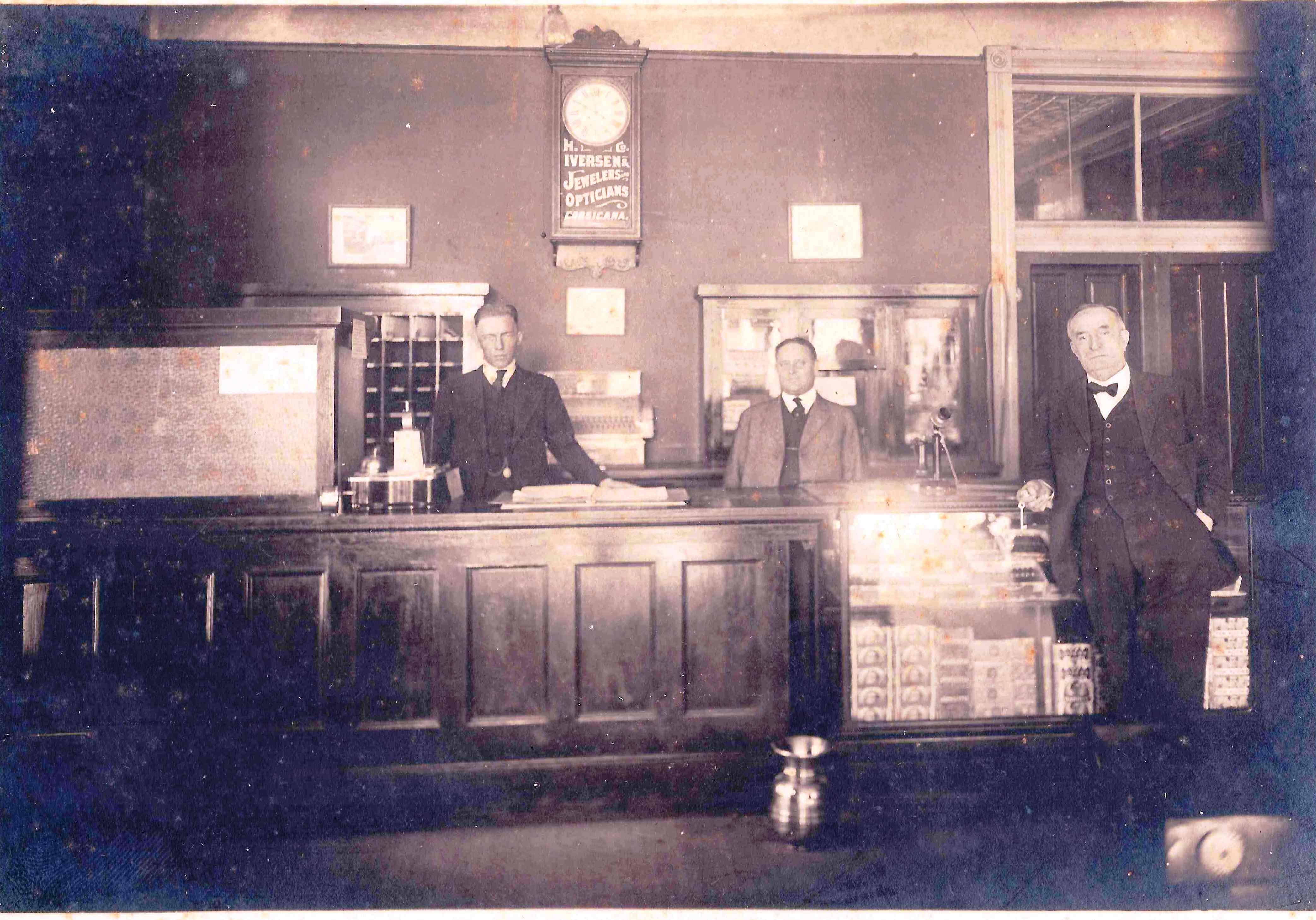 Photo #0001 - Inside view of store with three men. Clock has H. Iversen & Co. Jewelers and Opticians Corsicana. |