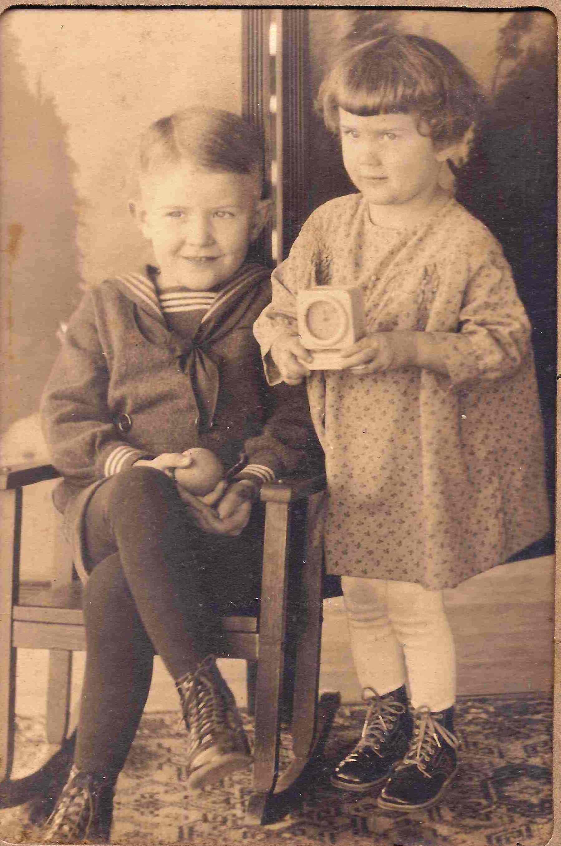 Photo #0019 - Young boy sitting with a ball next to young girl standing with clock. |