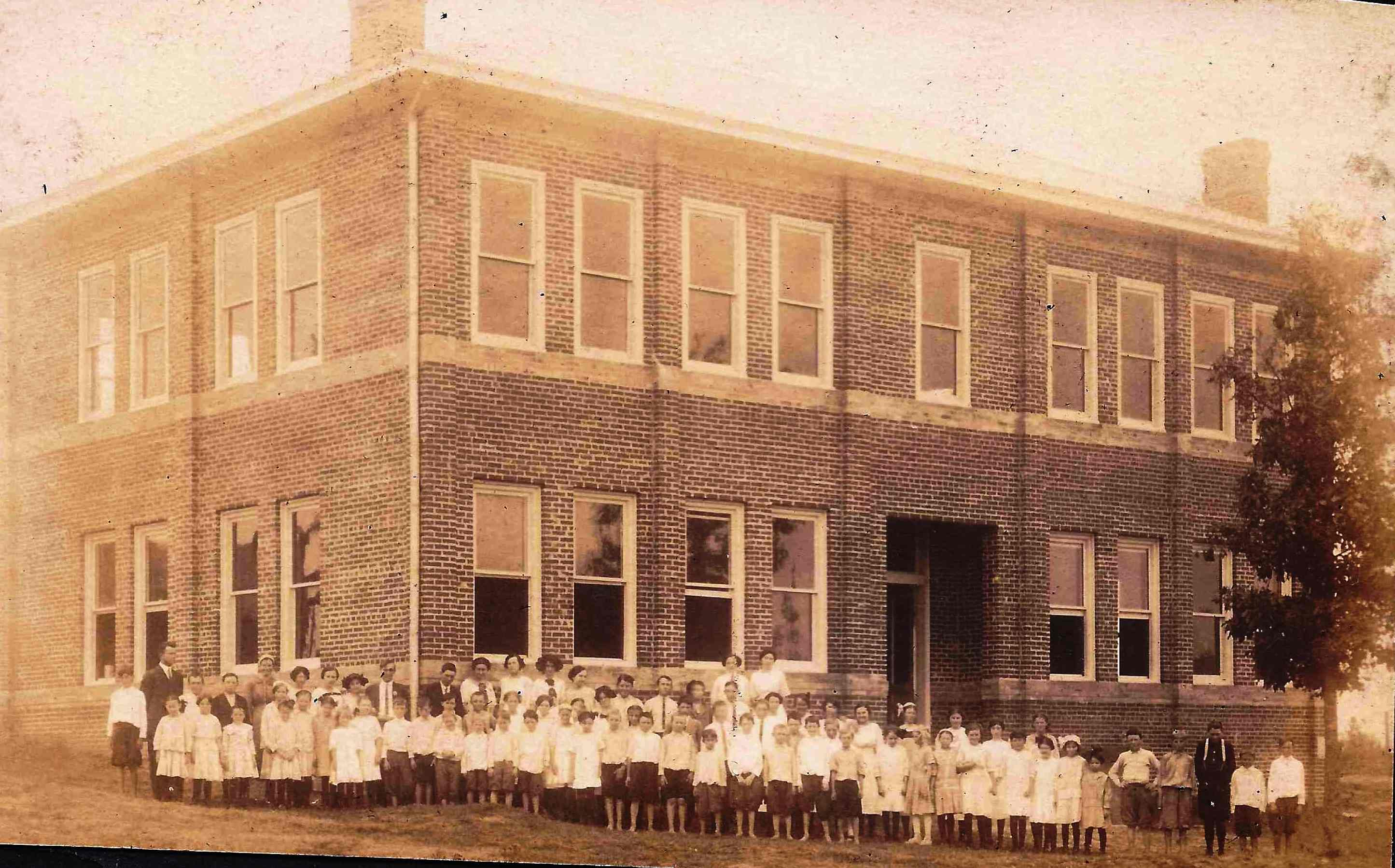Photo #0038 - A group of students in front of a brick two story school building. Is this the same building that is in the background of photo #0036. |
