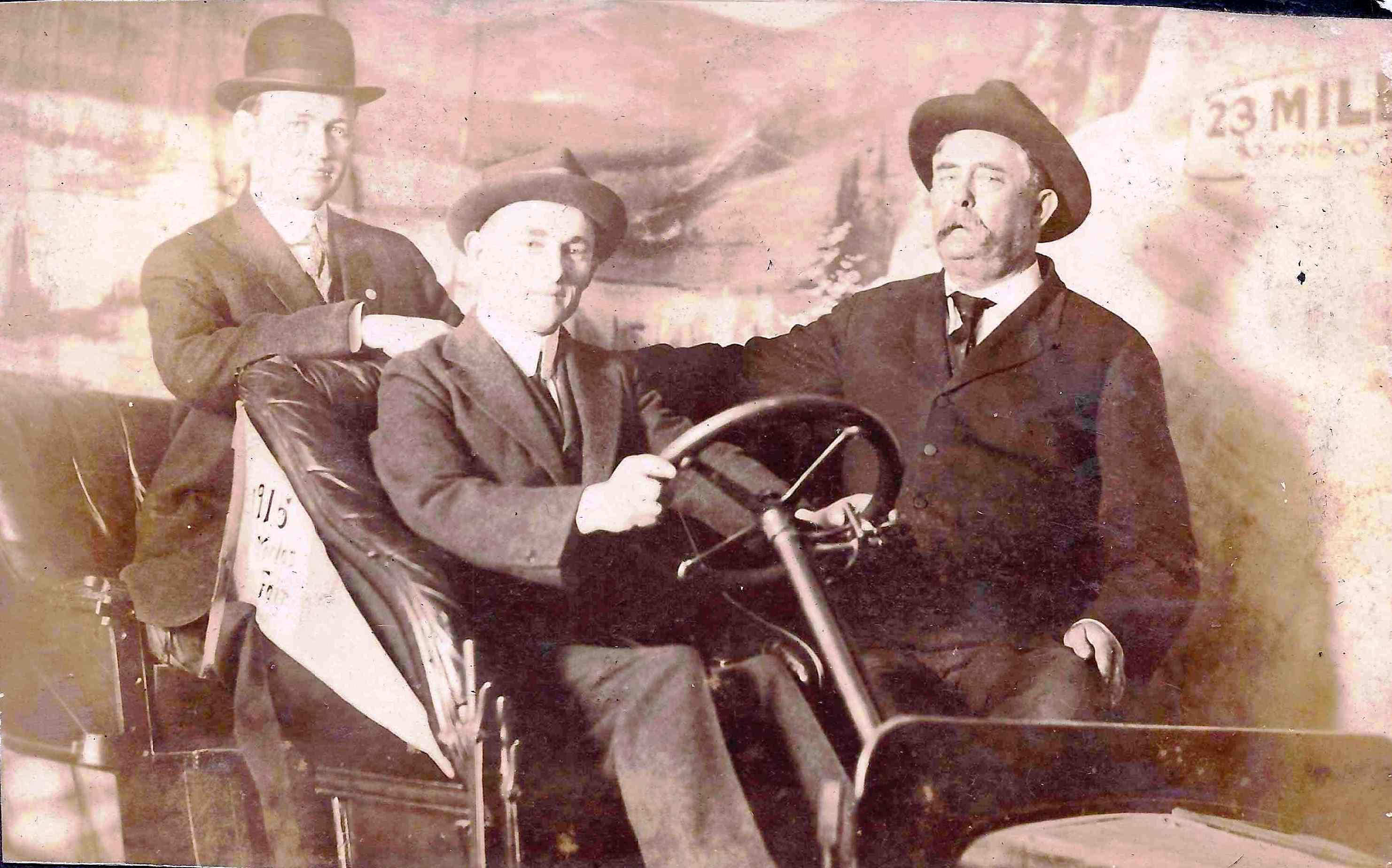 Photo #0040 - Three men in an automobile - seems to be staged with a backdrop. |