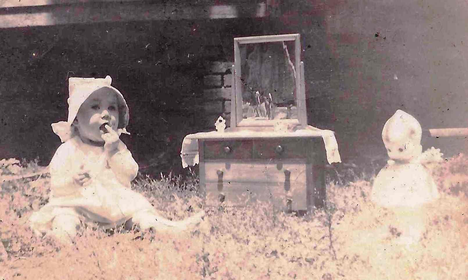 Photo #0049 - Baby with Kewpie doll and a toy dresser with a mirror |
