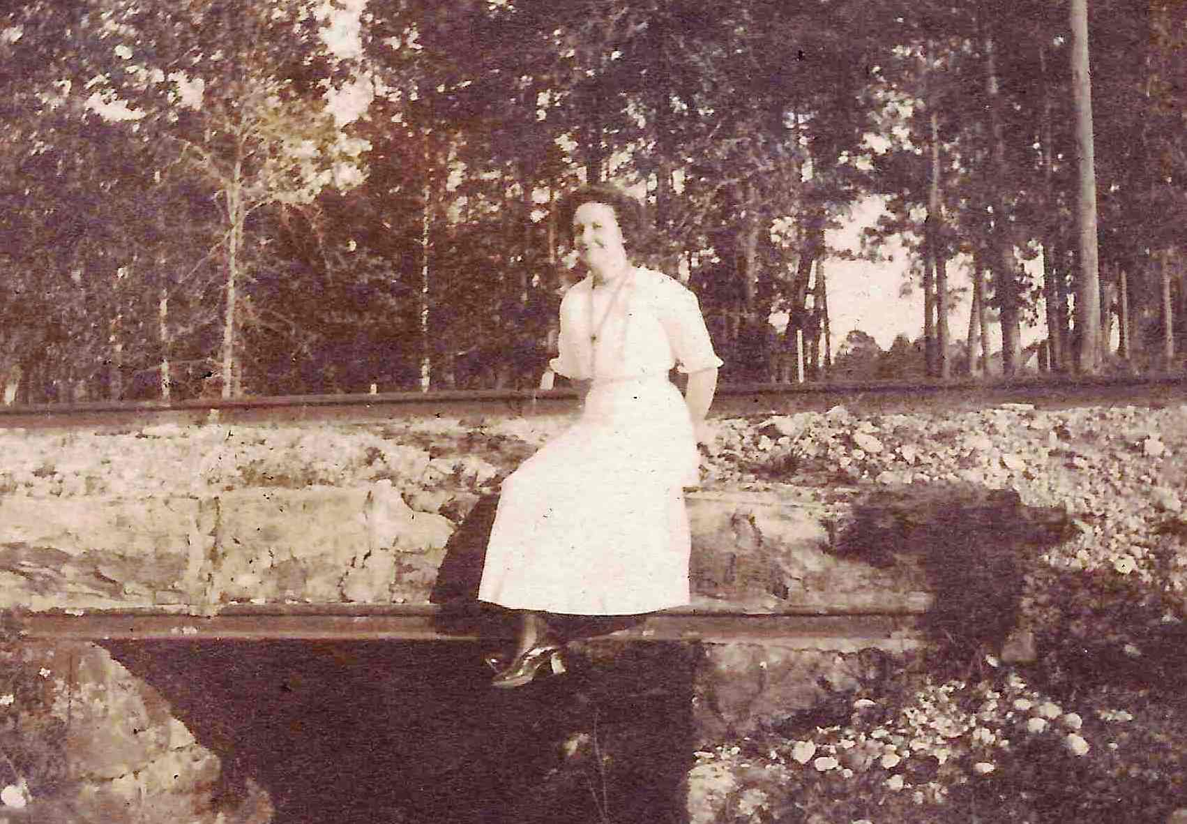 Photo #0056 - Lady sitting on a railroad bridge |