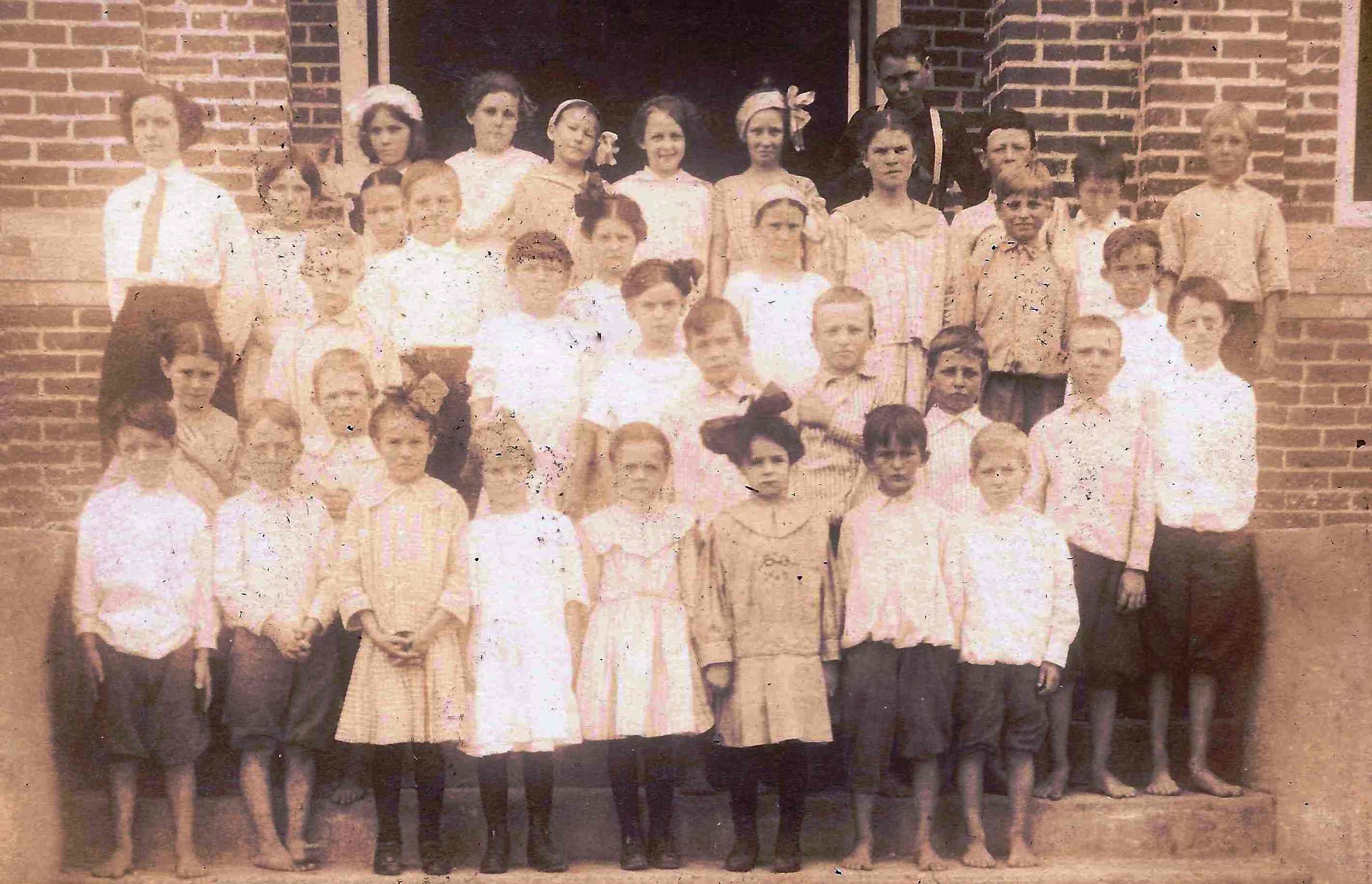 Photo #0057 - Group of students in front on brick building/school. The boys in front are bare footed. |